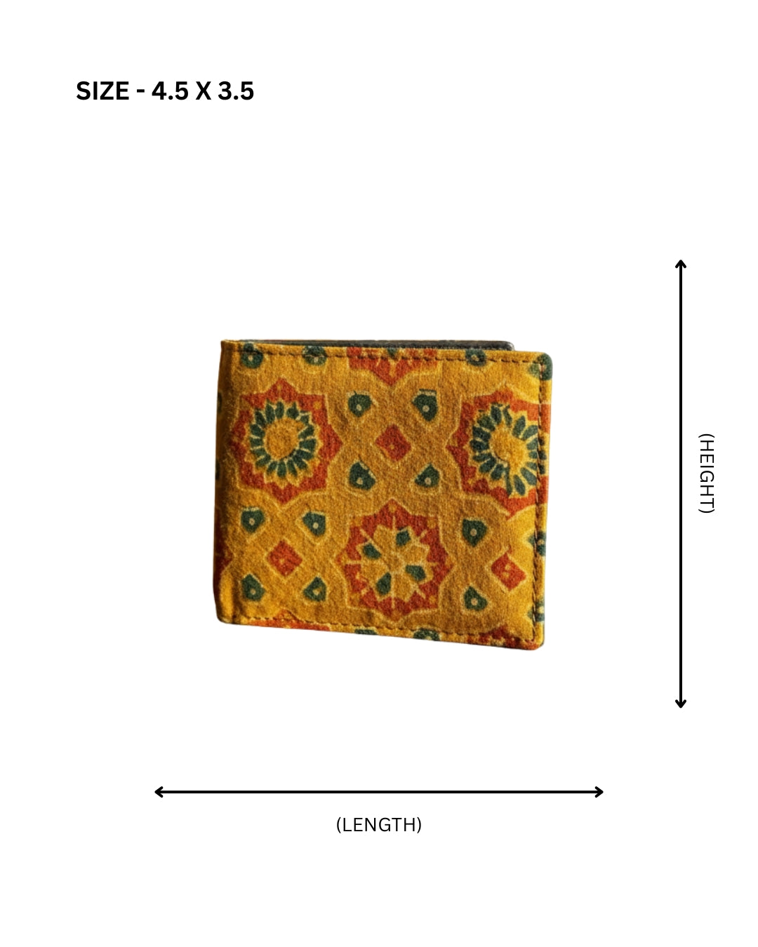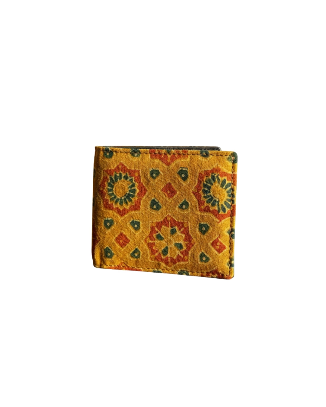 ● Handblock-printed Ajrak cotton wallet featuring intricate floral motifs in mustard yellow, deep red, and green tones.